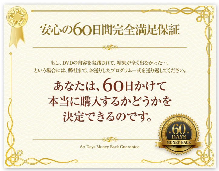 しかも、もし万が一…この技術を試してもまったく結果が出なかった場合は、 『無条件で全額返金保証』を受けることもできるのです。