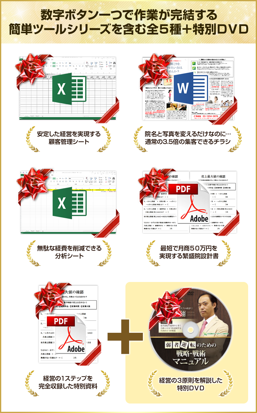新規集客の方法、継続患者さまになっていただく方法、売上の作り方、安定経営するための方法など何も知らなかった私でも結果が出せるようになります。